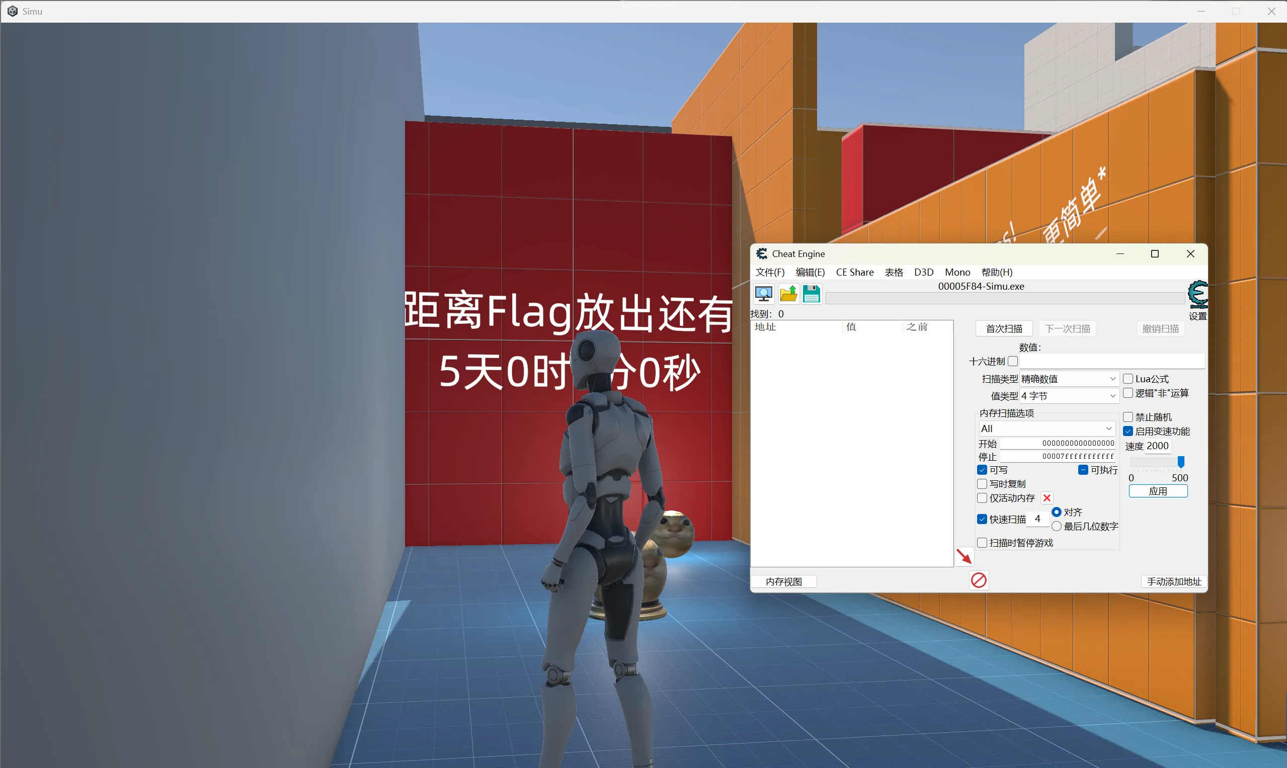 flag1这里有一个倒计时门,在考虑反编译之前先直接尝试变速。使用Cheat Engine的变速功能