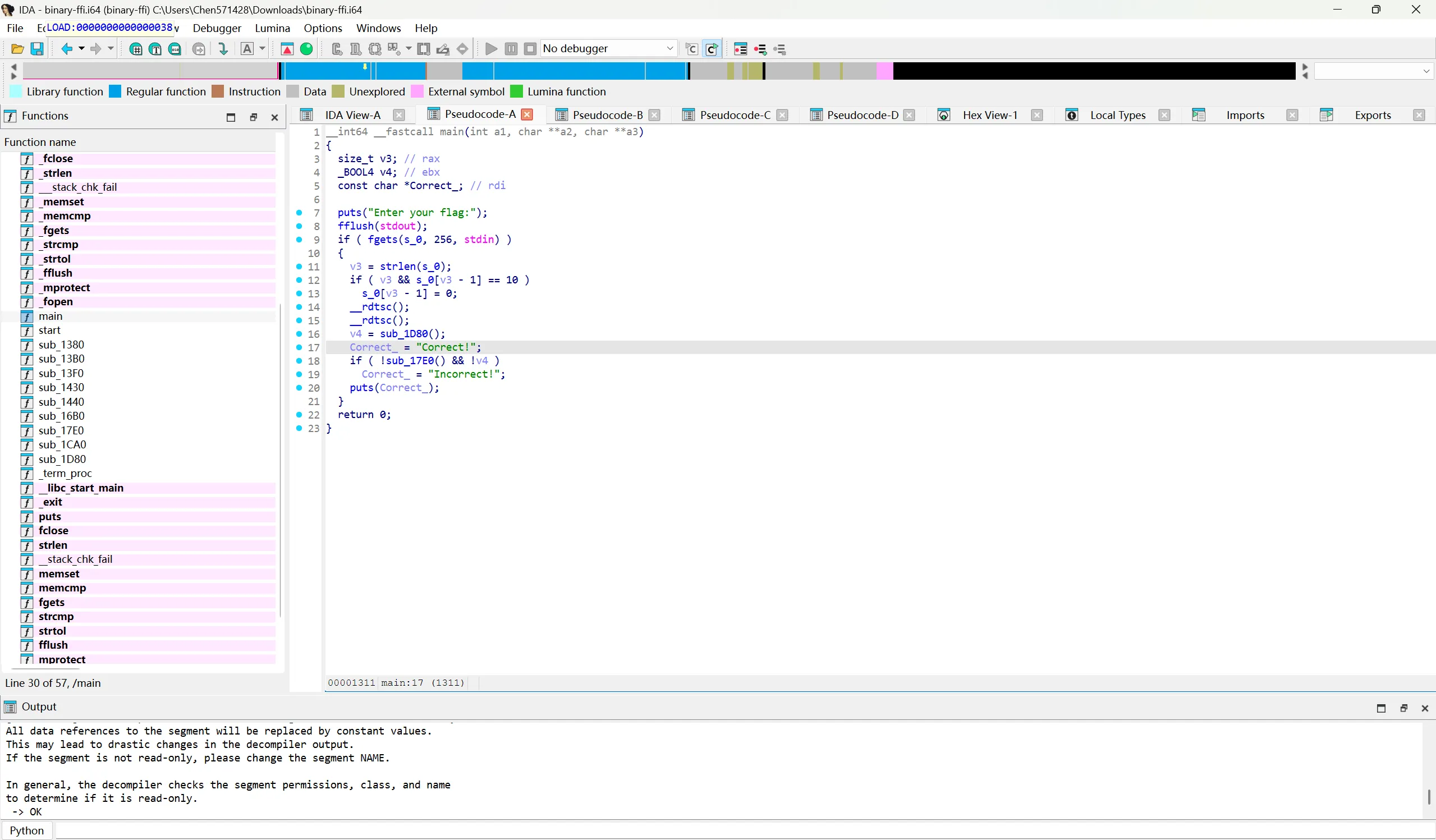 - 目标:从 ELF 可执行文件 `binary-ffi` 中找出正确的 Flag(程序会提示 `Enter your flag:`,输出 `Correct!` 或 `Incorrect!`)。